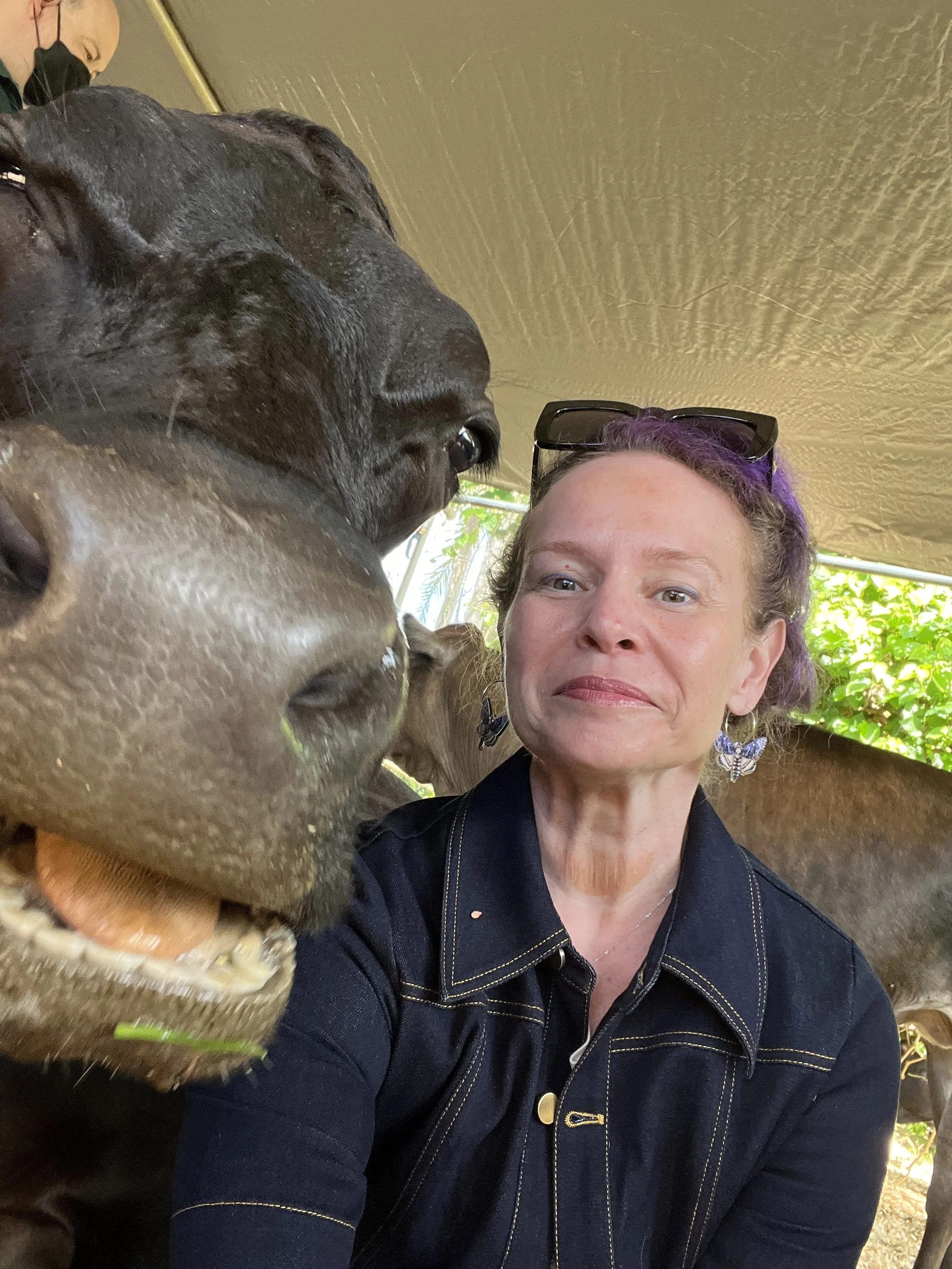 To fully embrace my time in the cow cuddle puddle, I came prepared—serving lewks in a fabulous jumpsuit by Lesley Evers. The midweight denim struck the perfect balance: structured enough for style, soft enough to sit cross-legged in the grass while snuggling a 1,200-pound cow. I paired it with a whimsical pop of color: purple moth earrings by Nicoletta Carlone, which fluttered at my ears like tiny symbols of transformation. Fashion and farm therapy? A surprisingly natural combo.