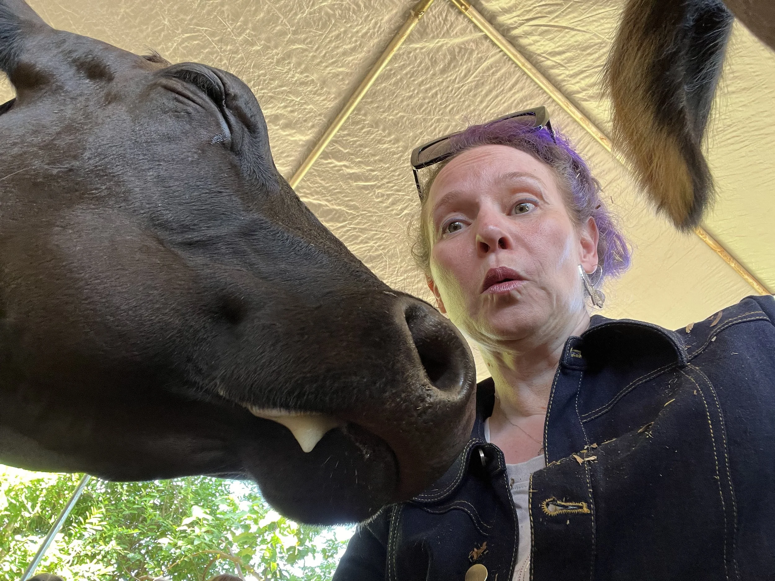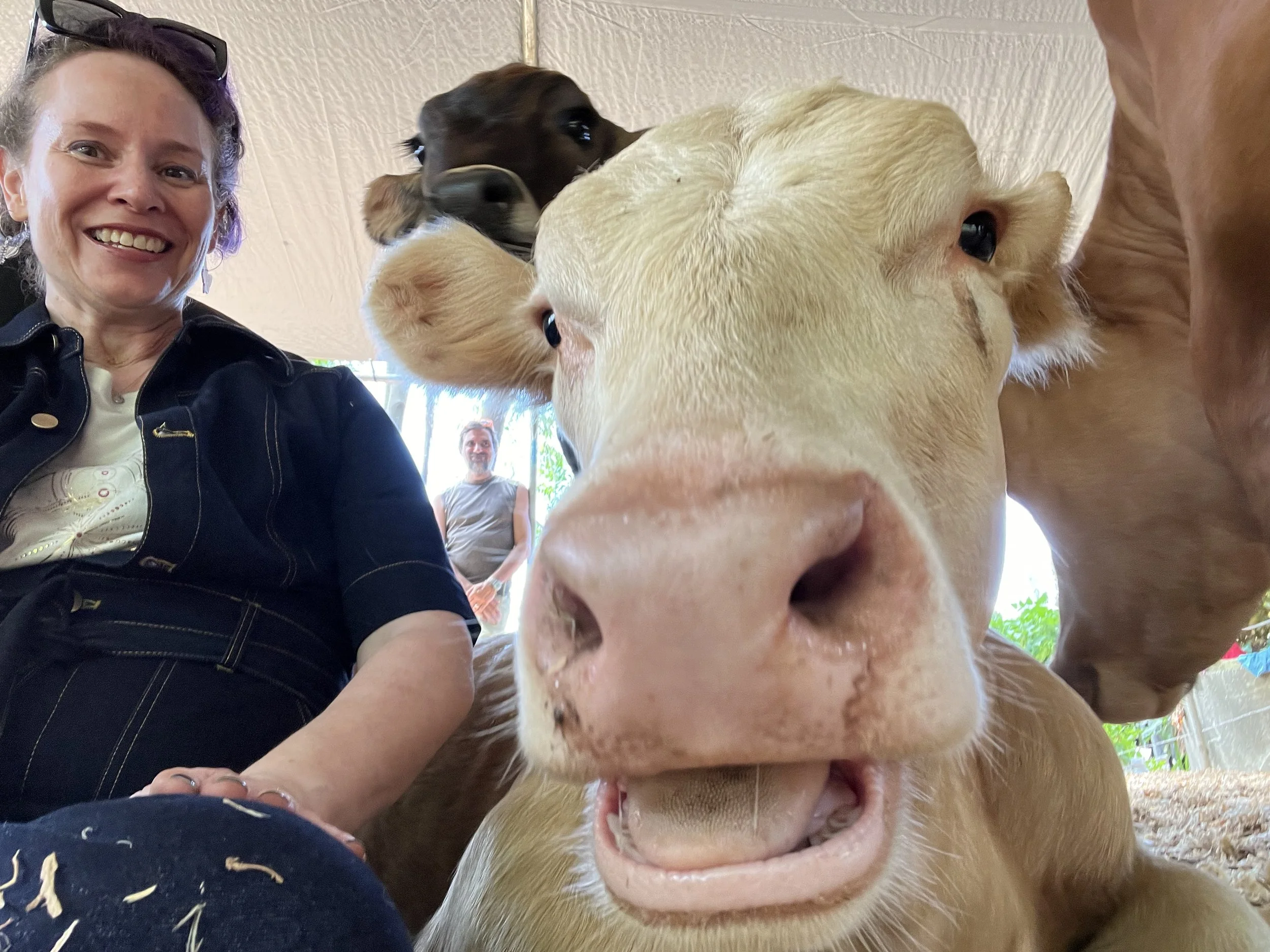 The cows? They’re basically 1,200-pound puppies. Gentle, affectionate, deeply soulful. The hour we spent snuggled up to them passed in a blur of nose kisses, soft fur, and warm cow breath. It felt more like a dream than a therapy session.