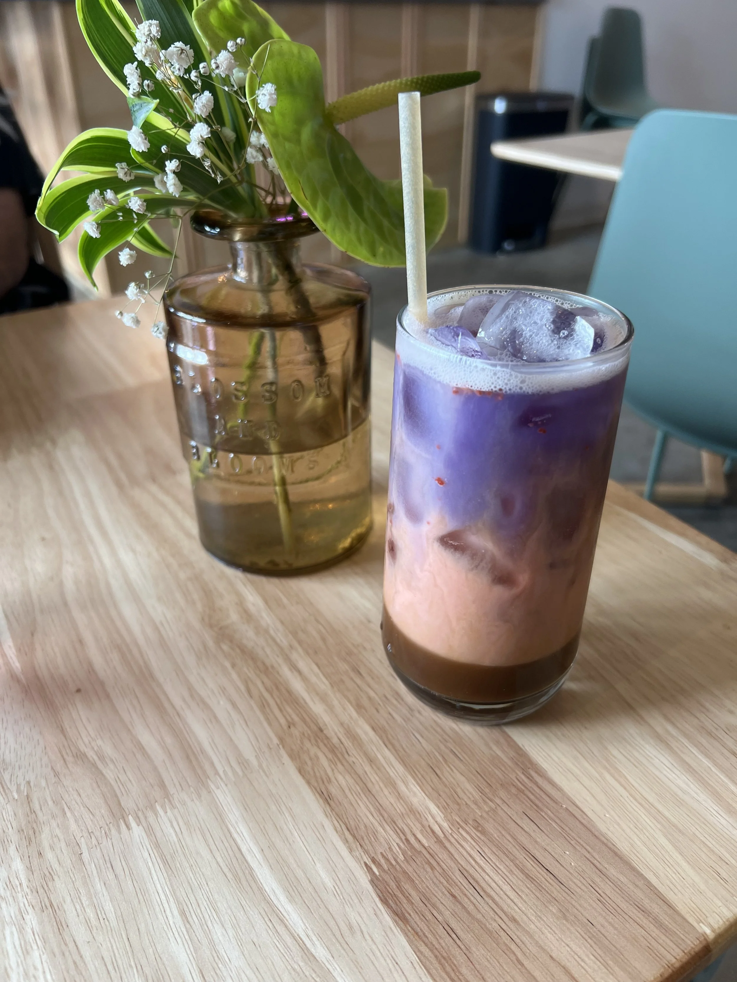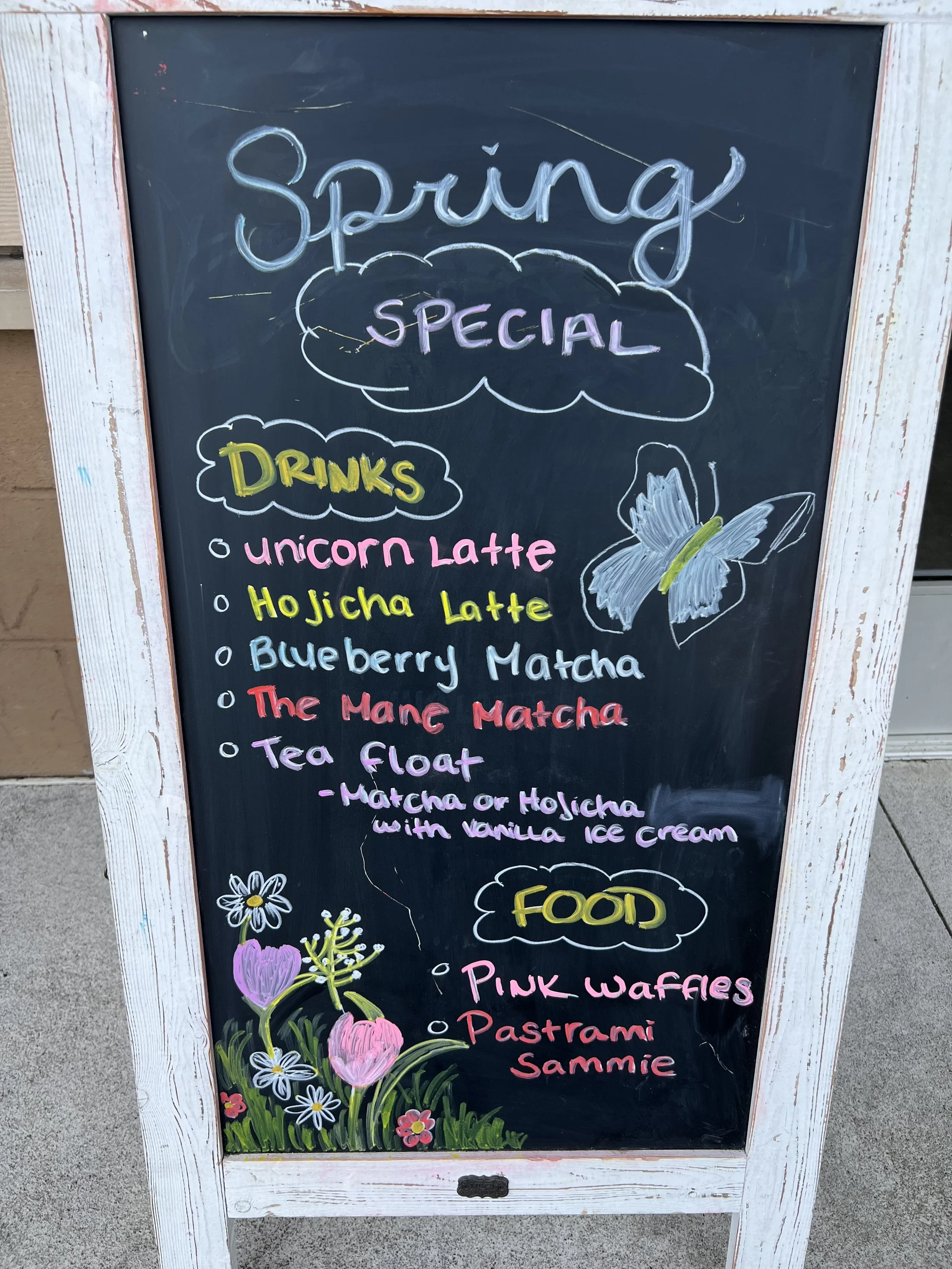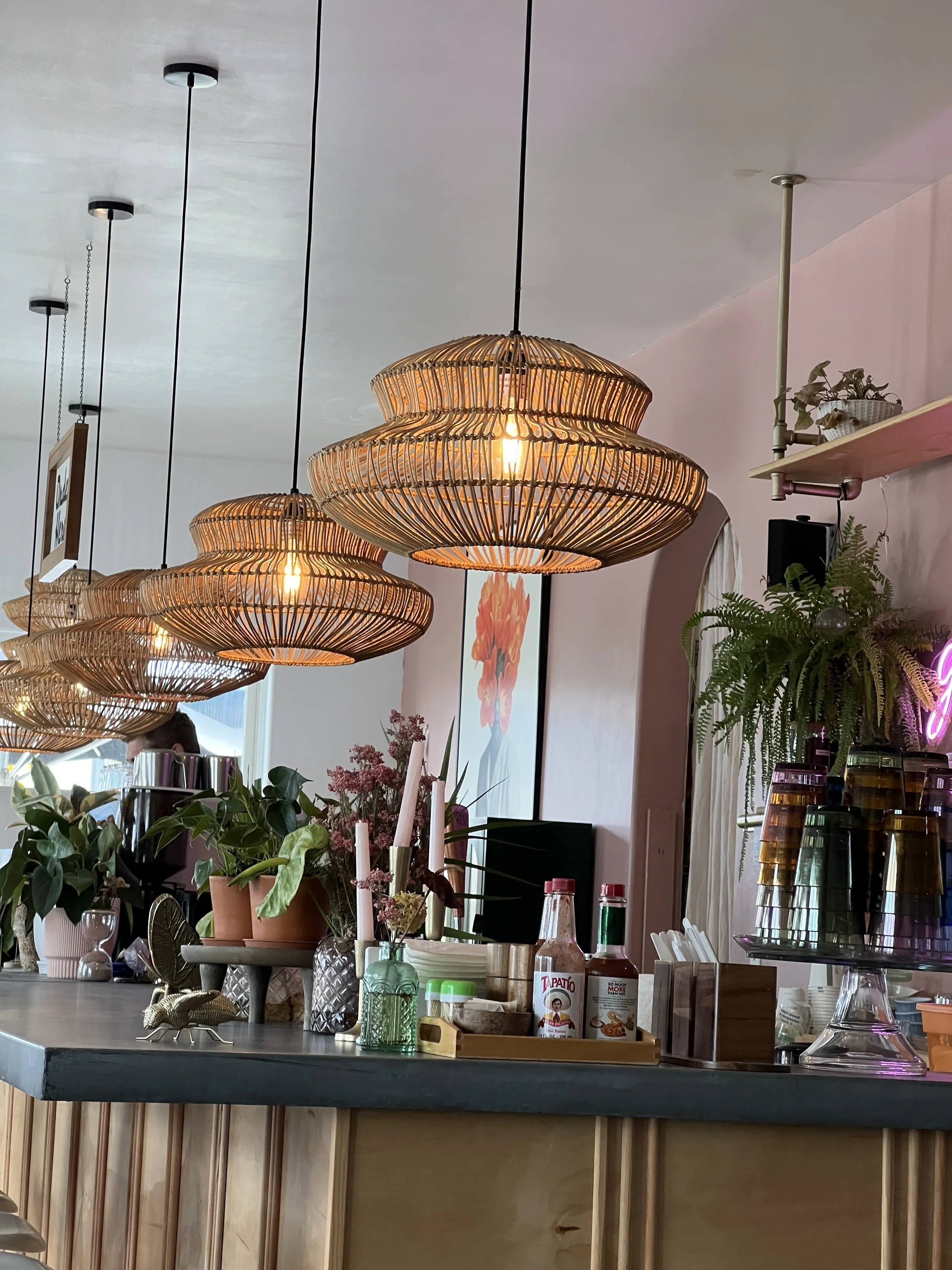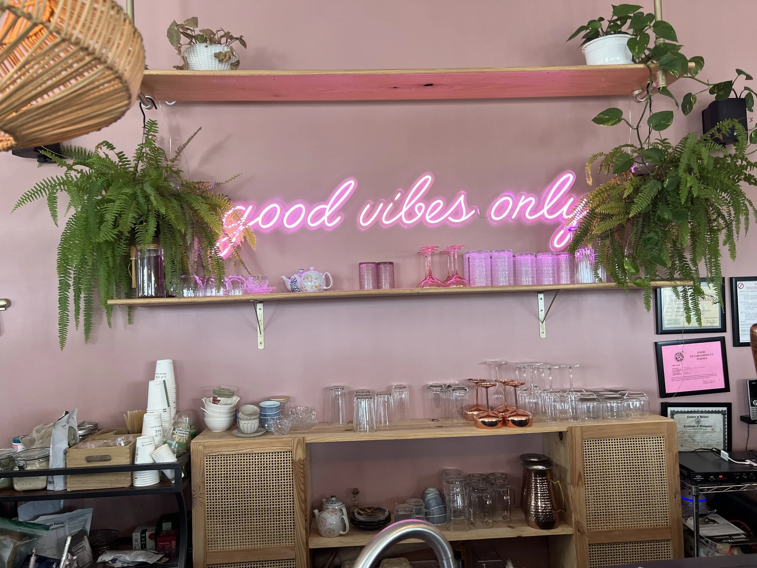 On Sunday, we were craving brunch, and Vibe Cafe kept popping up across multiple “must-visit” lists. When we pulled up, the parking lot was nearly empty—which felt suspicious for a Sunday morning. But as it turns out, we were just lucky it was a rainy morning. The moment we stepped in, it was clear we had found something special. The whole space looked like it had been designed by a queer garden fairy with a Pinterest board full of pink dreams.