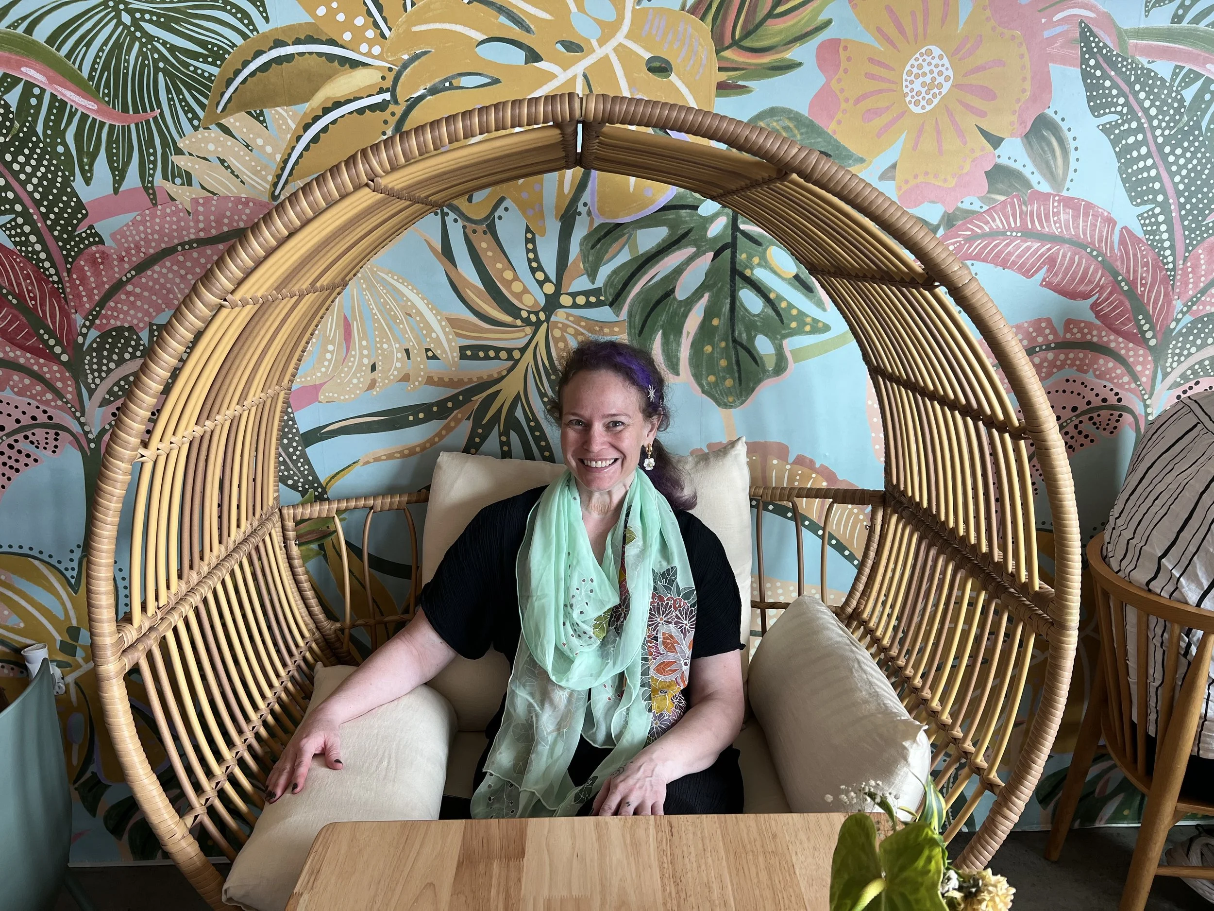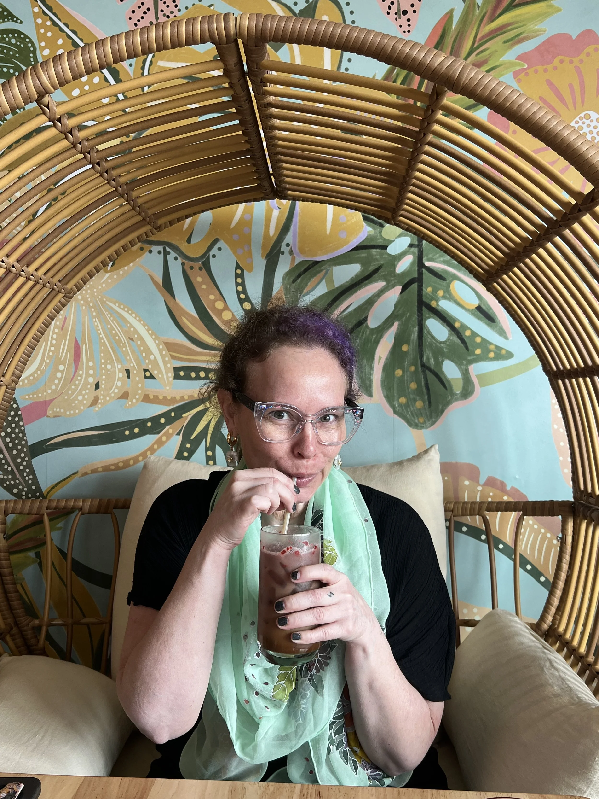 Vintage pink tropical wallpaper, hanging plants, and golden bee details surrounded us. I was seated—divinely, I might add—in the princess chair, a rattan canopy chair fit for maximum main-character energy. I sipped a unicorn latte (yes, it had pink sparkles) and bit into a gluten-free pink waffle that tasted like joy and summertime magic.