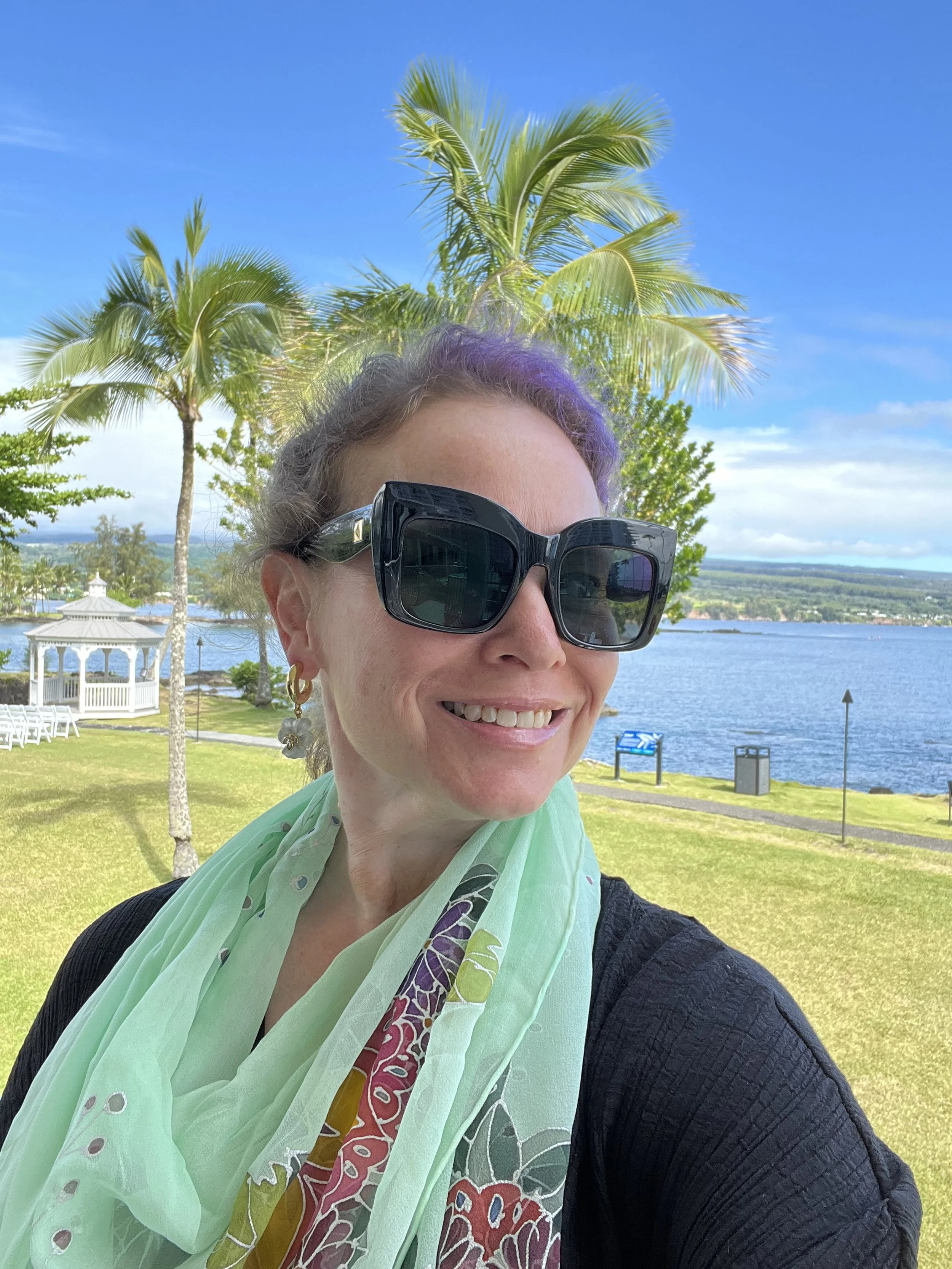 For Sunday brunch, I shifted into something a little softer but no less special: a hand-painted silk scarf by SilkScarvesTakuyo, an artisan based in Lihue, Hawaii, who sells through Etsy. I’ve collected several of their pieces over the years, and every one feels like wearable art. The brushstrokes, the color, the care—it’s the kind of accessory that turns heads and lifts spirits.